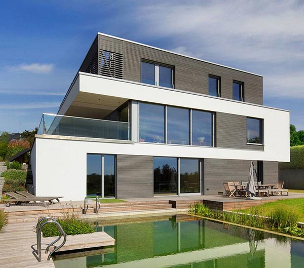 Mẫu biệt thự lắp ghép 3 tầng được thiết kế với hồ bơi và sân vườn tiểu cảnh. Được thiết kế theo phong cách hiện đại với các đường nét thẳng vuông vắn là đặc trưng của kiểu nhà này. Đây là sự kết hợp hoàn hảo của kỹ thuật xây dựng nhà lắp ghép với phong cách kiến trúc biệt thự hiện đại.