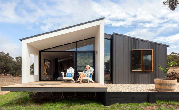 Mẫu nhà lắp ghép với mái hiên nghiêng đang được ưa chuộng ở các vùng quê có phong cảnh thiên nhiên hữu tình. Mang đến một vẻ đẹp nhẹ nhàng, ấm áp, ngôi nhà như một nơi nghỉ dưỡng của gia đình.