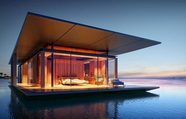Mẫu nhà lắp ghép nổi trên hồ nước kiến trúc sư đã sử dụng vật liệu nhẹ hiện đại, đủ nhẹ cho nhà có thể nổi trên mặt nước. Với mái hiên rộng cũng như các bức tường được làm hoàn toàn bằng kính, bạn có thể tận hưởng được khung cảnh thiên nhiên của đất trời khi sống trong ngôi nhà này.