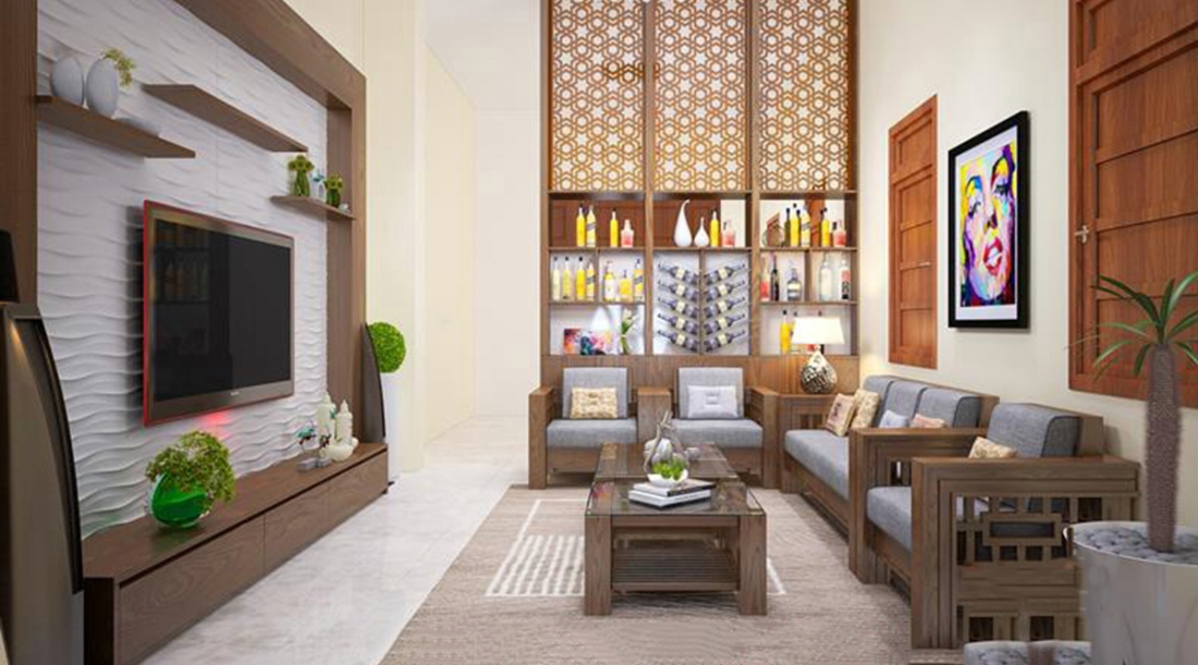 Phòng khách nhà ống dùng chất liệu gỗ: Gian phòng khách được trang hoàng các thiết bị nội thất làm từ chất liệu gỗ sẽ trở nên đẳng cấp, tinh tế và toát lên giá trị thẩm mỹ cực kỳ cao, lâu bền.