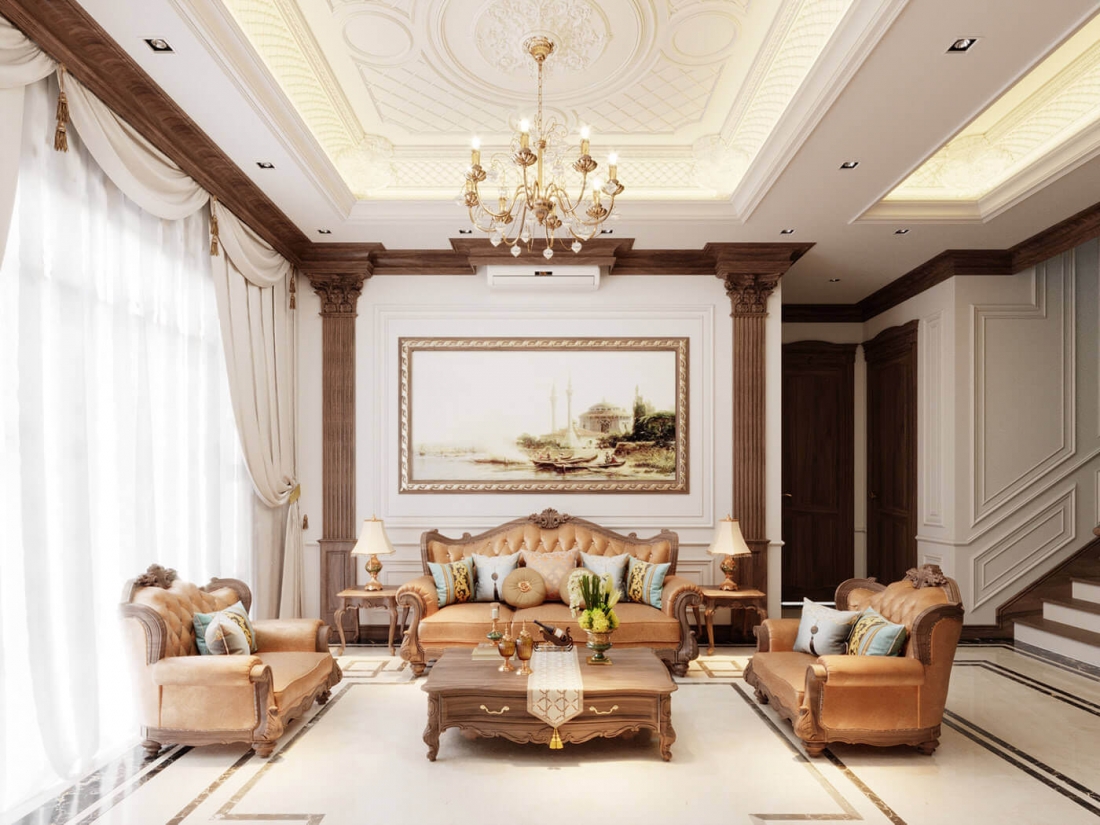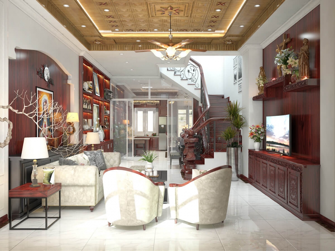 Phòng khách nhà ống kiểu cổ điển: Nếu bạn thích những gì hoài cổ thì hãy ưu tiên sử dụng các đồ dùng có thiết kế cầu kỳ, hoa văn tinh xảo và mang những gam màu nổi bật. Điển hình như màu vàng, nâu, xám, đen…