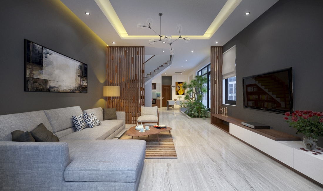 Phòng khách nhà ống kiểu hiện đại: Với phong cách hiện đại, bạn cần chú trọng vào các thiết bị thông minh cùng cách sắp xếp đồ vật gọn gàng để đảm bảo tính tiện lợi tối đa trong quá trình sinh hoạt thường ngày.