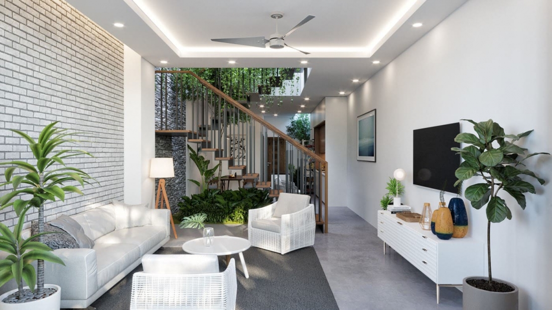 Phòng khách nhà ống hòa hợp với thiên nhiên: Nếu muốn sống gần gũi với thiên nhiên và có tình yêu với cây cối thì chắc chắn đây là thiết kế phòng khách dành riêng cho bạn. Hãy trồng các loại cây có tác dụng điều hòa, thanh lọc không khí xen kẽ với các chậu cây giả để không gian sống luôn tràn ngập sắc xanh.