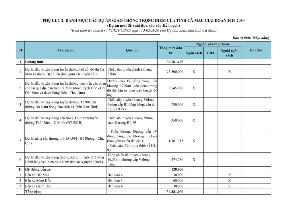 Trong giai đoạn 2026 - 2030, Cà Mau ưu tiên triển khai 18 dự án giao thông trọng điểm đã được phê duyệt hoặc đang hoàn tất thủ tục chủ trương đầu tư với tổng nhu cầu vốn khoảng 28.700 tỷ đồng. Nguồn vốn thực hiện gồm ngân sách Trung ương, ngân sách địa phương và vốn vay ODA.