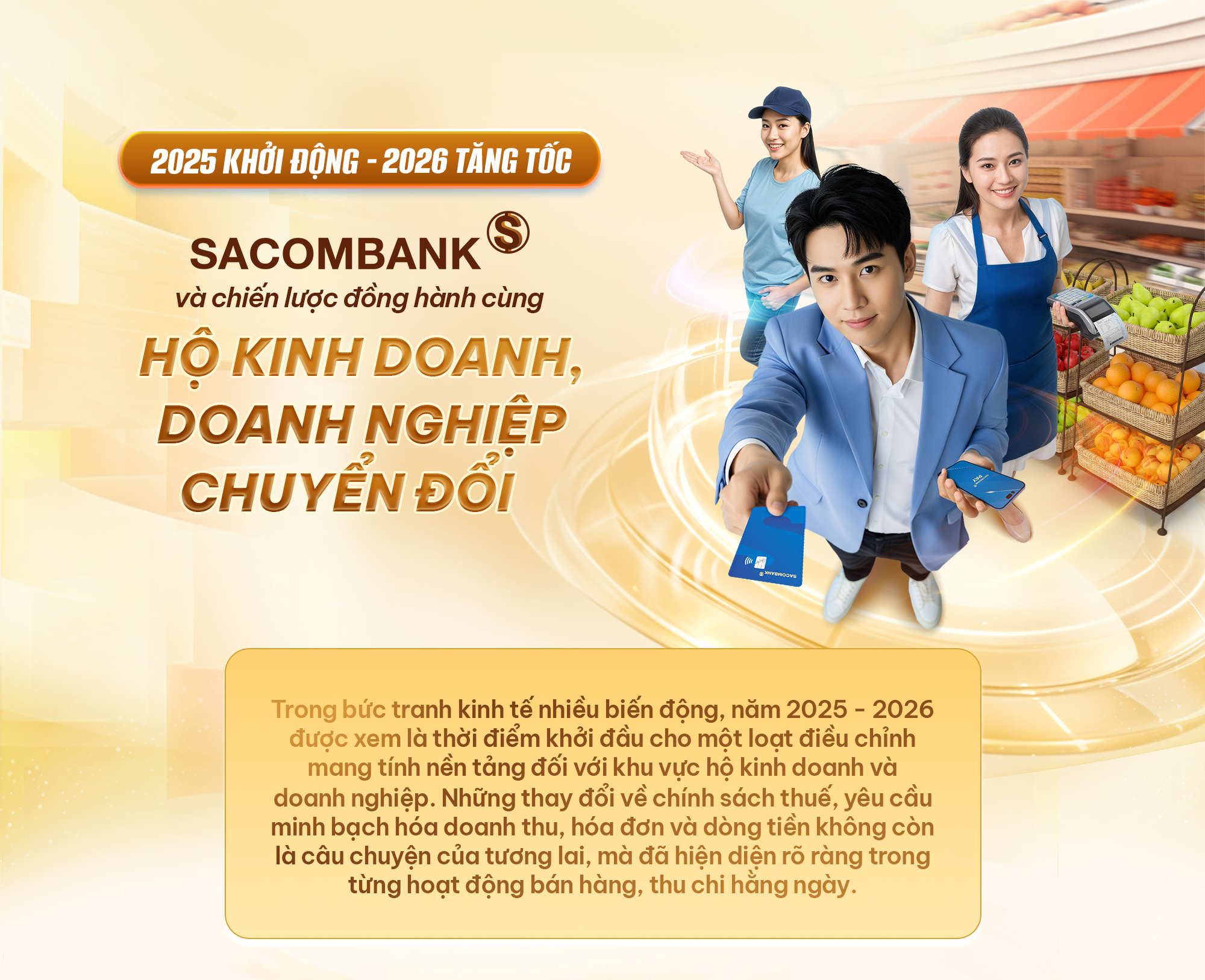 Khi môi trường kinh doanh biến đổi nhanh, lợi thế dài hạn không thuộc về những mô hình tăng trưởng nóng, mà thuộc về những đơn vị đủ bản lĩnh để tổ chức lại chính mình. Trong tiến trình đó, SACOMBANK lựa chọn đứng ở vị trí của một đối tác phát triển dài hạn - sẵn sàng đồng hành cùng hộ kinh doanh và doanh nghiệp từ những thay đổi nhỏ nhất trong vận hành, để cùng kiến tạo những bước tiến lớn hơn, bền vững hơn trong tương lai.