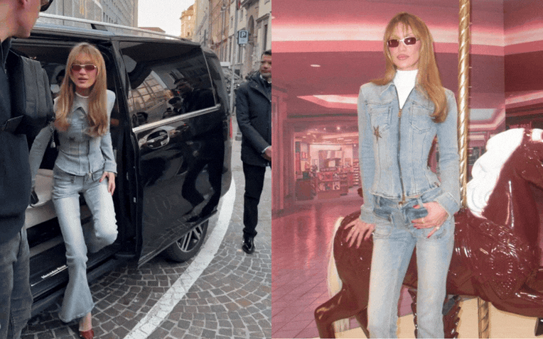 Bella Hadid gây ấn tượng ngay từ khi xuất hiện với set đồ mang đậm chất Y2K. Nữ người mẫu diện nguyên cây denim wash gồm áo corset jacket ôm sát và quần jeans cạp trễ ống loe nhẹ, tôn trọn đường cong cơ thể. Tất cả các chi tiết đều gợi nhớ tới hình ảnh những siêu mẫu thập niên 90s. Bella hoàn thiện outfit bằng kính râm và giày cao gót đỏ, tạo điểm nhấn nổi bật và vẫn giữ tinh thần retro phóng khoáng.