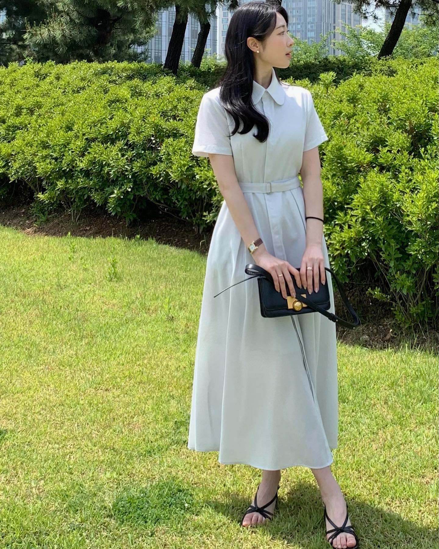 Đặc điểm nhận diện của váy sơ mi là hàng cúc chạy dọc thân váy, cổ bẻ và phần tay áo đa dạng từ ngắn đến dài. Nhờ cấu trúc đơn giản, váy sơ mi dễ dàng thích nghi với nhiều hoàn cảnh khác nhau, từ đi làm, họp hành cho đến những buổi gặp gỡ nhẹ nhàng sau giờ làm.