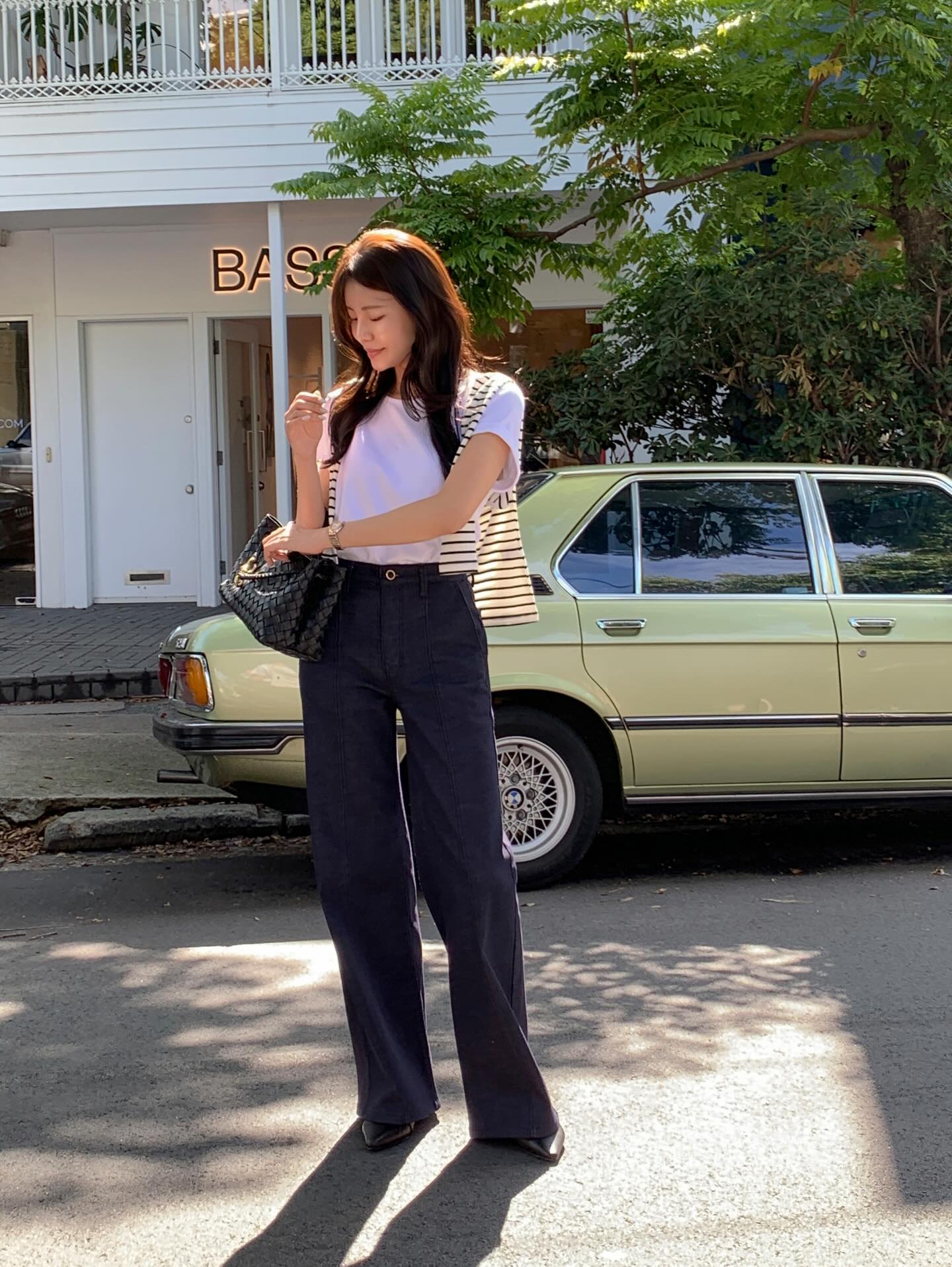Set đồ này đặc biệt phù hợp cho những ngày cần vẻ ngoài gọn gàng nhưng không quá cứng nhắc. Quần trắng dáng suông hoặc ống đứng sẽ giúp tổng thể trông thanh thoát hơn. Bạn có thể kết hợp cùng sandal quai mảnh hoặc giày mule để tăng thêm nét tinh tế.