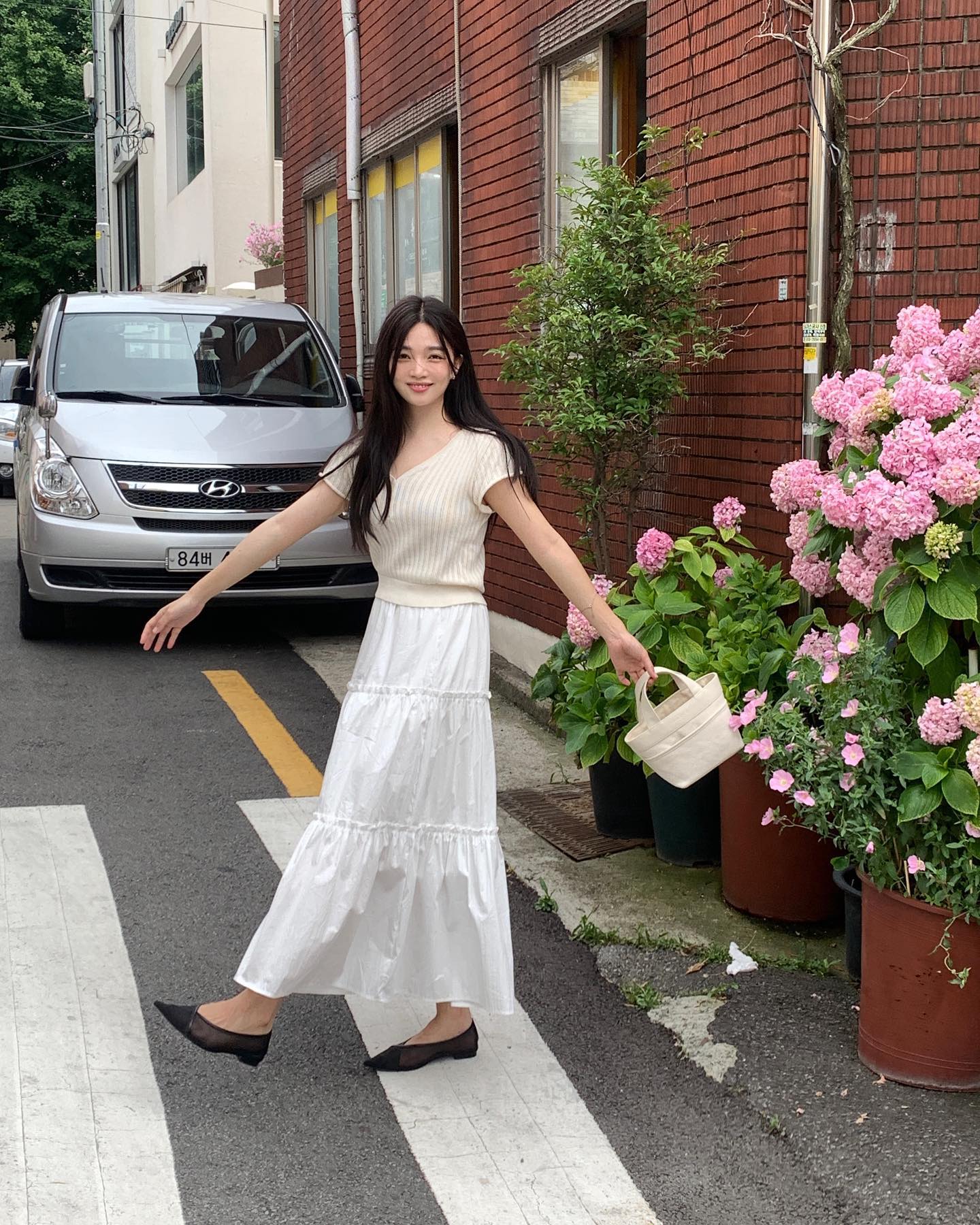 Không có gì kinh điển hơn sự kết hợp giữa áo trắng và chân váy dài. Đây là công thức "an toàn" nhưng chưa bao giờ nhàm chán. Áo trắng mang lại cảm giác sạch sẽ, thanh thoát, trong khi chân váy dài giúp tổng thể thêm phần nữ tính và mềm mại.