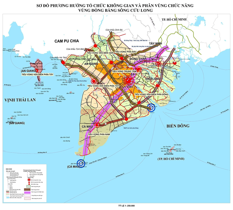 2.Tiểu vùng ven biển phía Đông bao gồm phía Đông TP. Cần Thơ, Vĩnh Long, Đồng Tháp và Cà Mau. Các đô thị Trà Vinh, Sóc Trăng, Gò Công, Bạc Liêu trở thành trung tâm động lực gắn với khu công nghiệp và Khu kinh tế Định An. Định hướng phát triển kinh tế biển, công nghiệp năng lượng tái tạo (điện gió, điện mặt trời), công nghiệp chế biến và nuôi trồng thủy sản. Đây là khu vực sẽ bứt phá mạnh nhờ cảng Trần Đề, cảng Định An, trở thành cửa ngõ xuất khẩu thủy sản và năng lượng xanh của vùng.