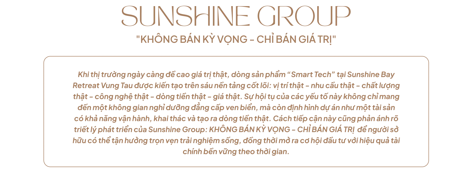 Chất lượng thật tại Sunshine Bay Retreat Vung Tau được minh chứng qua sự giao thoa hoàn hảo giữa ngôn ngữ kiến trúc vị nhân sinh, hệ tiện ích 5 sao phong phú và tiêu chuẩn vận hành theo chuẩn quốc tế, xác lập của một biểu tượng kiến trúc mới trên bản đồ Skyline ven biển phương Nam.