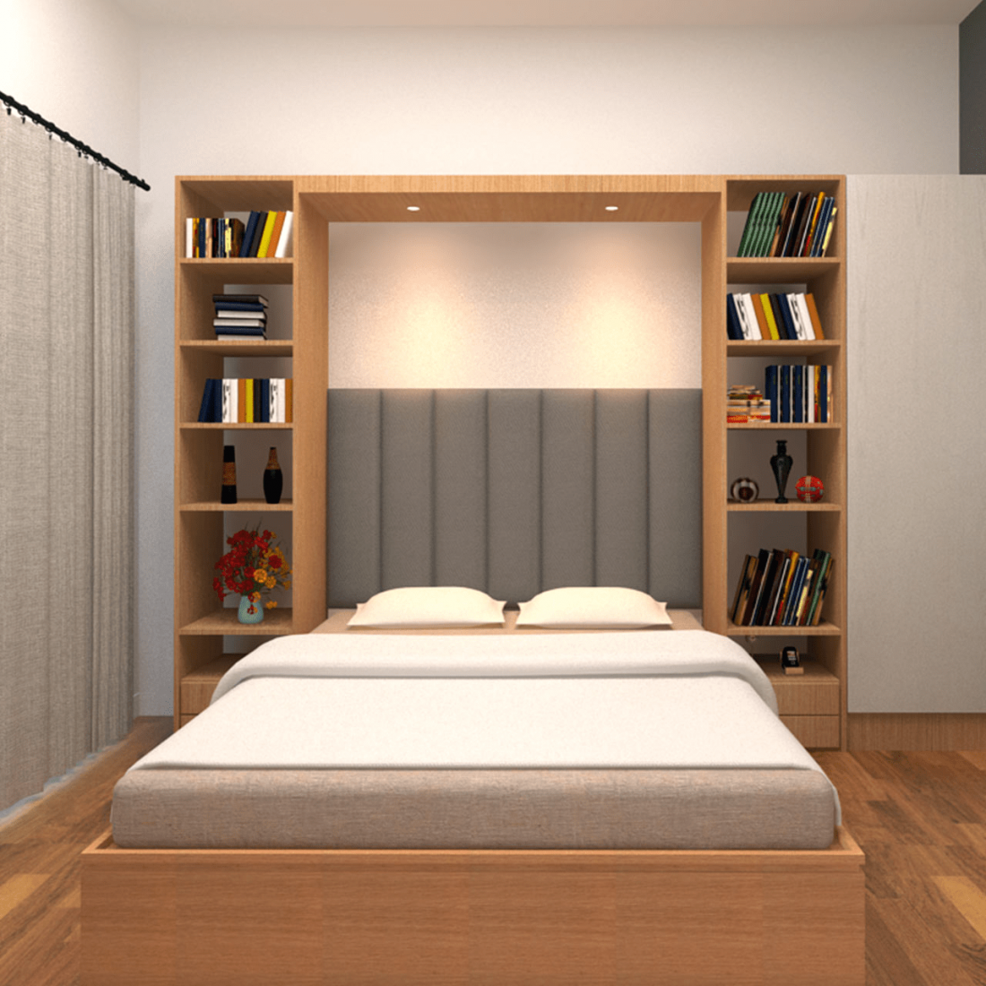 Phía đầu giường được "biến" thành một chiếc kệ kết hợp cùng hệ thống đèn tường mang lại một không gian cực kỳ ấn tượng và hấp dẫn.