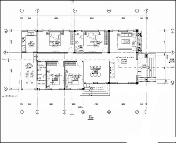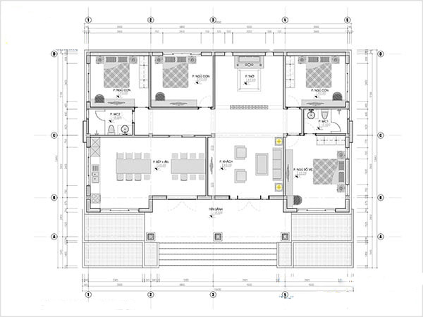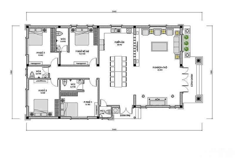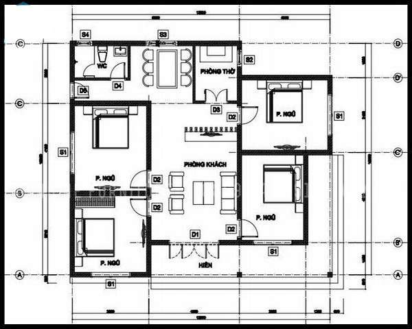 Bản vẽ mặt bằng với đầy đủ công năng của nhà cấp 4 có 4 phòng ngủ.