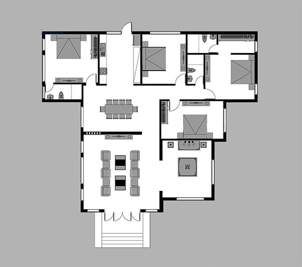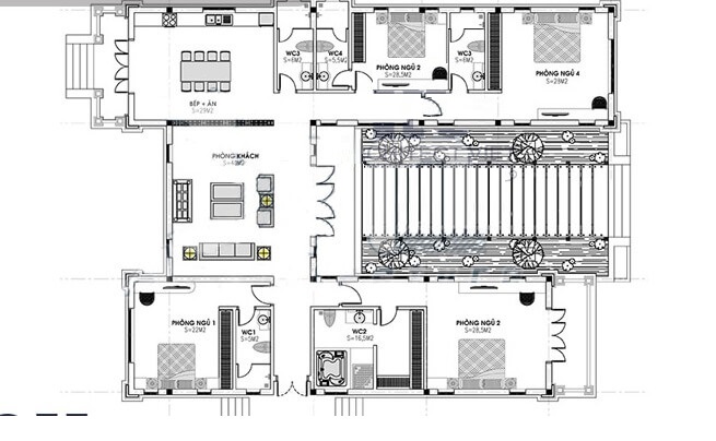 Bản vẽ mặt bằng nhà cấp 4 có 4 phòng ngủ phân chia hợp lý.