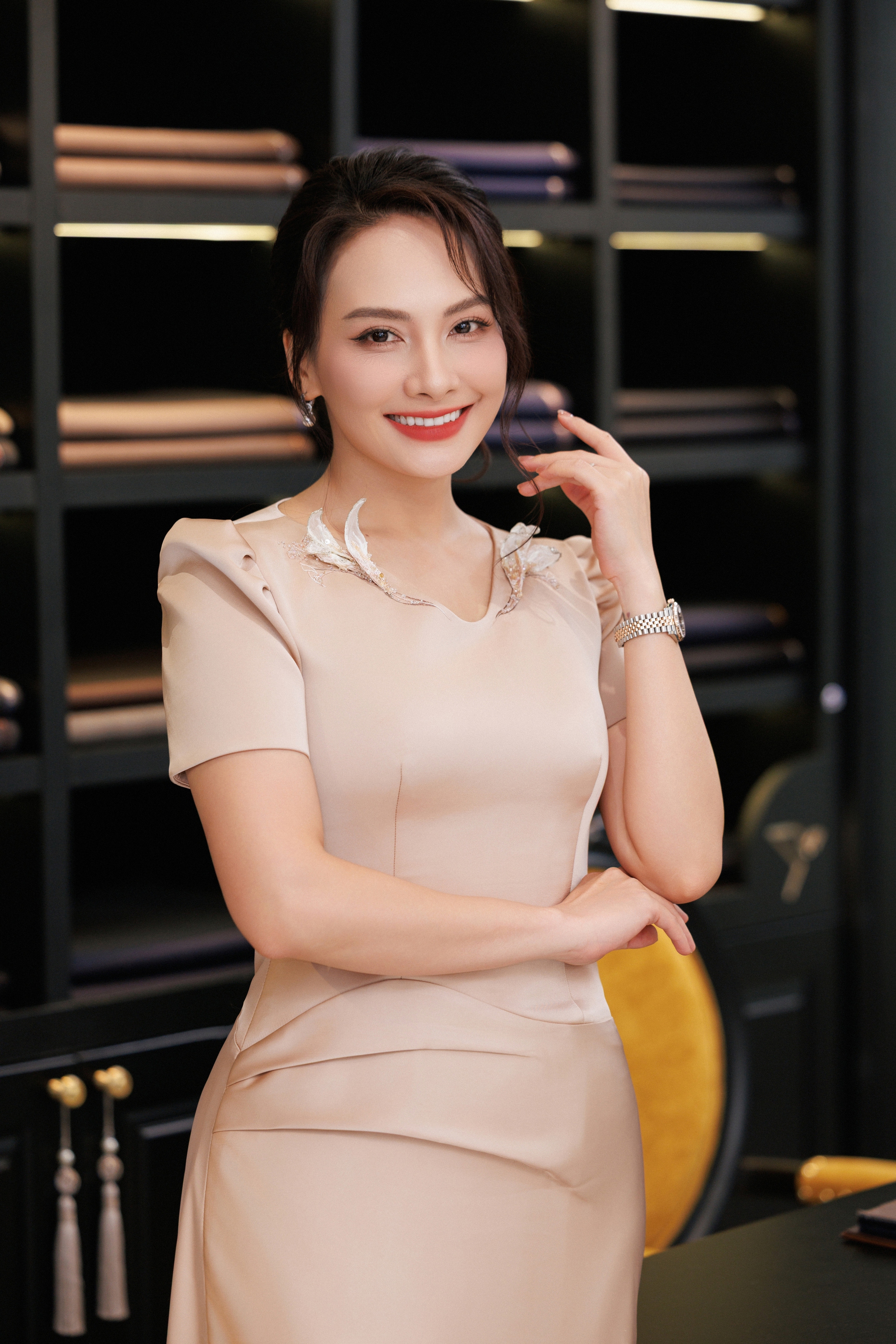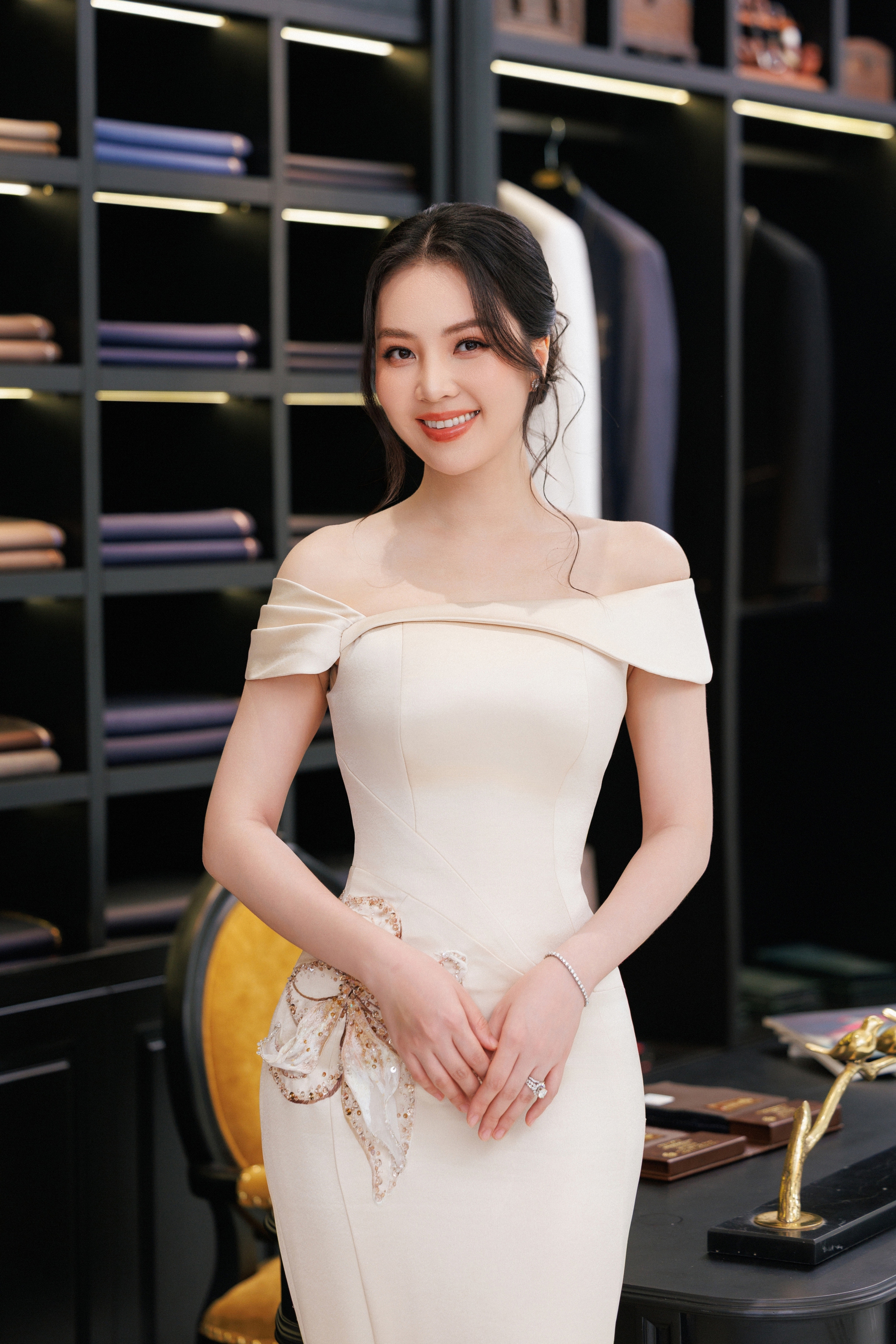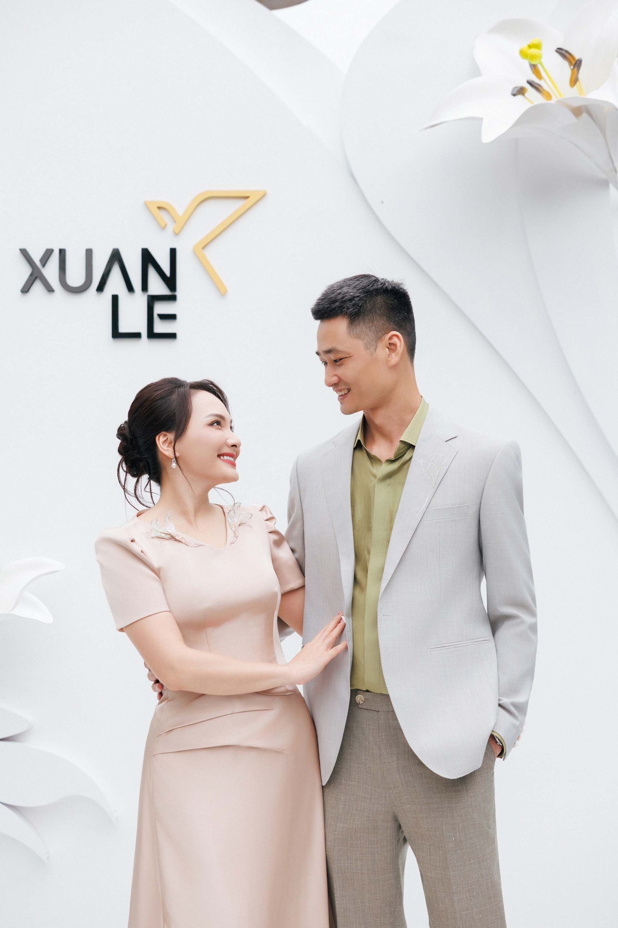 Diễn viên Bảo Thanh xuất hiện cùng chồng trong bộ sưu tập mới nhất - Thinh Lặng’26. ‘Bà mẹ hai con’ diện thiết kế nhẹ nhàng, tinh tế với điểm nhấn tại phần cổ với chi tiết hoa huệ tây ba chiều trong khi ông xã lịch lãm trong mẫu suit đũi và áo sơ mi lụa tơ tằm cao cấp.