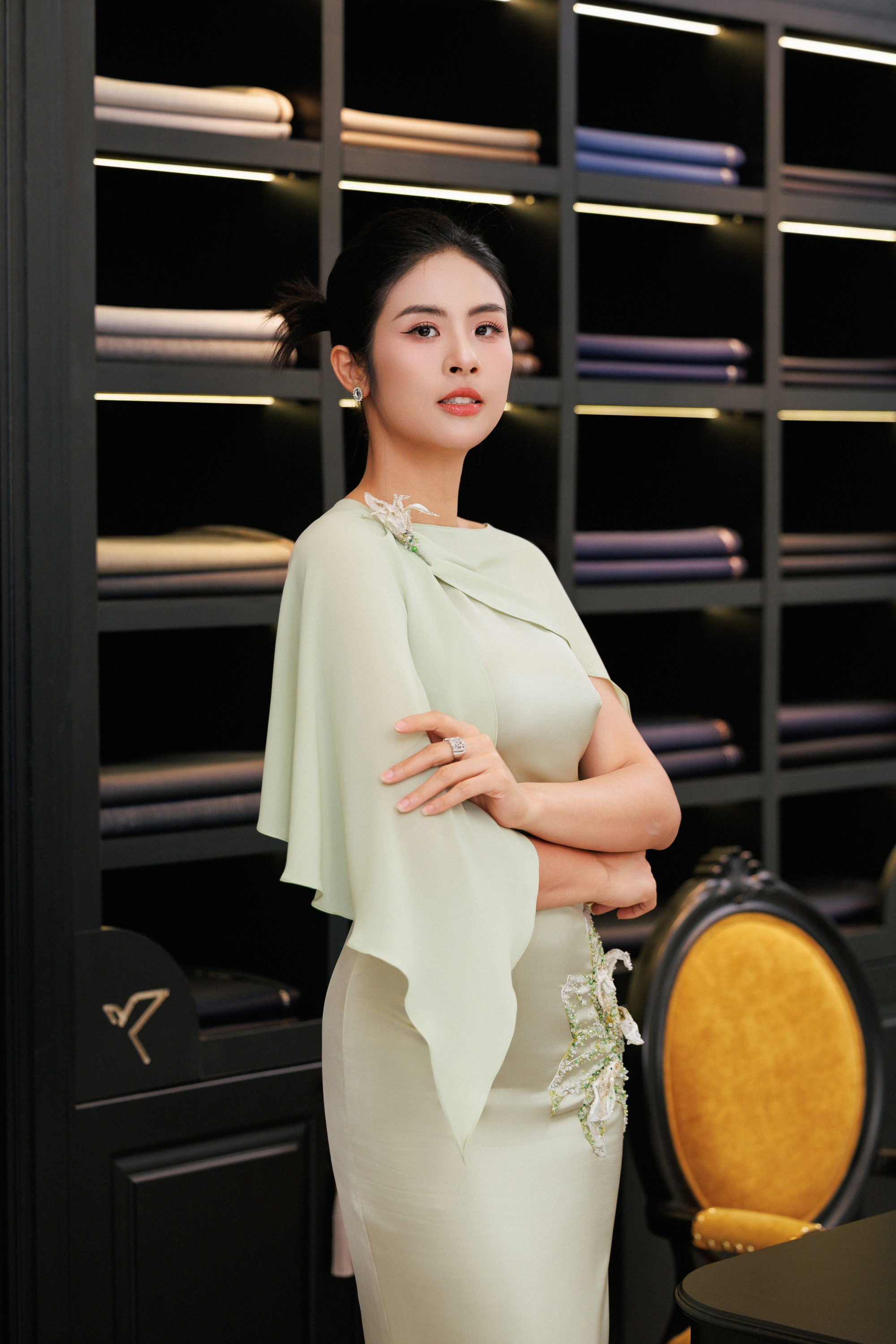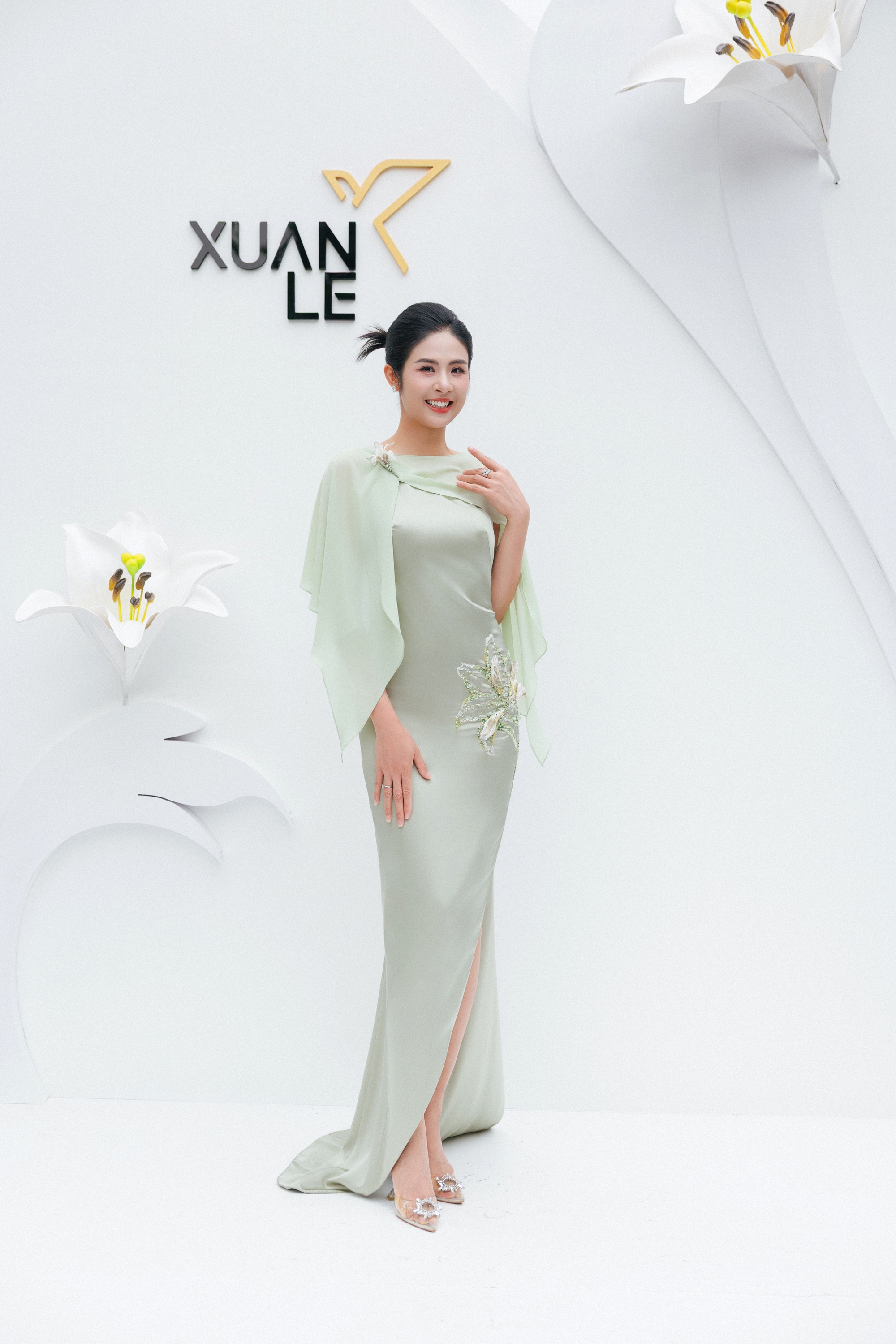 Hoa hậu Ngọc Hân xuất hiện nền nã, sang trọng trong thiết kế đầm dạ hội độc bản của XUANLE. Hình ảnh hoa huệ tây được cách điệu qua chi tiết tạo tác hoa ba chiều, kết hợp cùng những đường cắt cong mềm tại phần xẻ tà và tà choàng, tạo nên một chuyển động nhẹ, gợi cảm thức thanh thoát và lắng đọng.