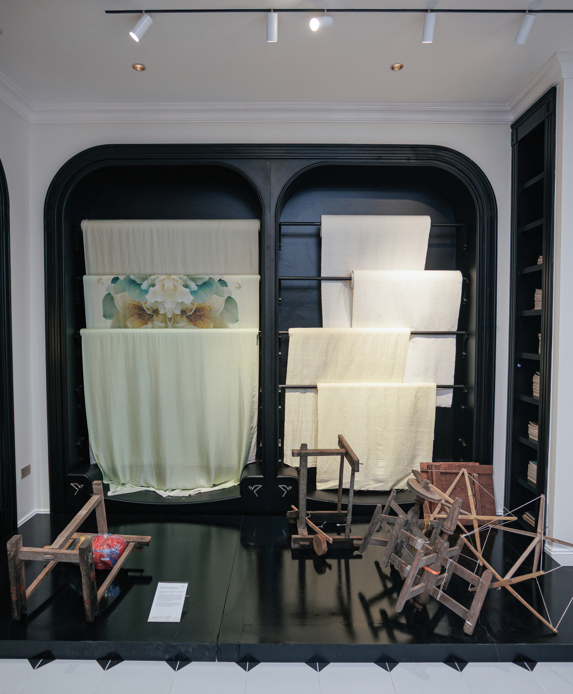 Không gian triển lãm còn trưng bày các mẫu phác thảo, kỹ thuật thủ công cao cấp và dòng vải lụa tơ tằm độc quyền mà NTK Xuân Lê kết hợp với hoạ sĩ người Thuỵ Sĩ gốc Việt - Minh Phạm. Lấy dáng hình loài hoa huệ tây làm trung tâm của sự chuyển hoá tinh thần THINH LẶNG, màu sắc, dáng hình loài hoa đặc trưng của tháng 4 đã được tái diễn giải bằng ngôn ngữ thời trang đương đại để trở thành cảm hứng cho bộ sưu tập Xuân Hè 2026 của thương hiệu.