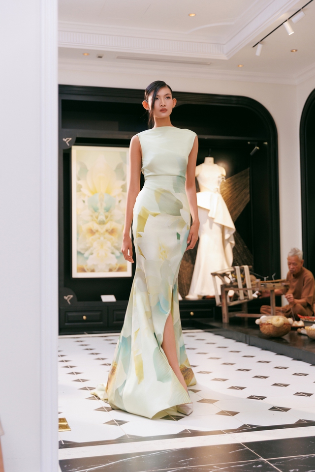 NSƯT Chiều Xuân xuất hiện nền nã, cổ điển trong thiết kế dạ hội Eternal Peony, với dấu ấn kỹ thuật phối chỉ chuyển sắc cao cấp của thương hiệu. Bên cạnh đó, Hồng Khanh - diễn viên của phim ‘Thế hệ kỳ tích’ mang đến tinh thần trẻ trung, nhẹ nhàng trong thiết kế organza kết hợp chân váy trắng, tạo nên một đối thoại thị giác giữa hai thế hệ.