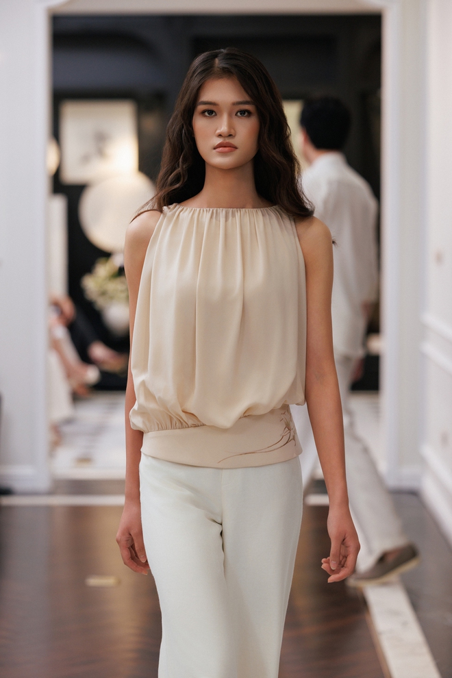 Ngôn ngữ thời trang di sản đương đại của XUANLE hiện diện qua hoạ tiết lụa tơ tằm được thiết kế độc bản của riêng thương hiệu cùng hoạ sĩ Thuỵ Sỹ gốc Việt Minh Phạm, tái diễn dải màu sắc, dáng hình loài hoa huệ tây một cách mềm mại, lắng sâu.