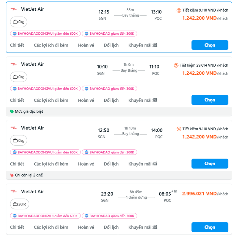 Trên chặng TP.HCM - Phú Quốc, hãng thường có nhiều chuyến bay mỗi ngày, trải đều từ sáng đến tối. Tuyến Hà Nội - Phú Quốc cũng được VietJet khai thác thường xuyên, đặc biệt vào các giai đoạn cao điểm du lịch như mùa hè hoặc các dịp nghỉ lễ dài ngày.