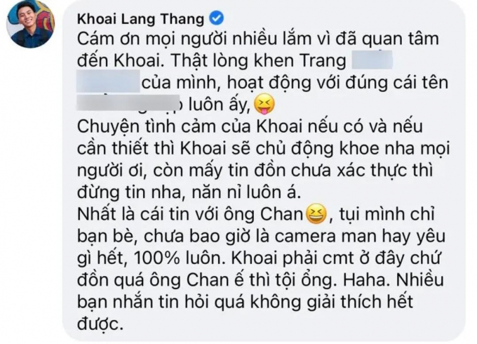 Lập tức, người trong cuộc đã lên tiếng phân trần và khẳng định mối quan hệ với Chan La Cà chỉ là bạn bè thân thiết: "Chuyện tình cảm của Khoai nếu có và nếu cần thiết sẽ chủ động khoe nha mọi người. Còn mấy tin đồn chưa xác thực thì đừng tin nha, năn nỉ luôn. Nhất là cái tin với ông Chan, tụi mình chỉ là bạn bè, chưa bao giờ là camera man hay yêu gì hết, 100% luôn. Khoai phải bình luận ở đây chứ đồn quá ông Chan ế thì tội ổng. Nhiều bạn nhắn tin hỏi quá không giải thích hết được".