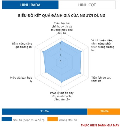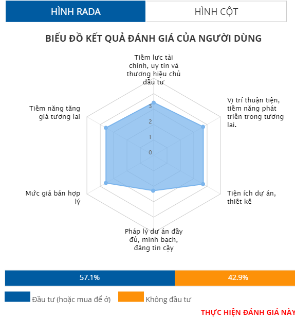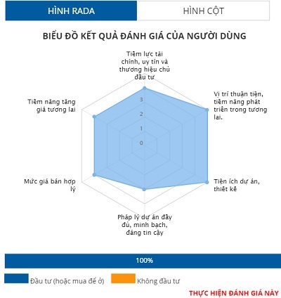 Do đó, dự án cũng không nhận được sự đánh giá tốt của độc giả khi các tiêu chí chỉ đạt cao nhất là 3,6 điểm ở vị trí và thấp nhất là 3 điểm ở tiêu chí mức giá. Các tiêu chí còn lại lần lượt là pháp lý 3,1/5, tiềm năng, tiềm lực, tiện ích đầu đạt 3,4/5 điểm.