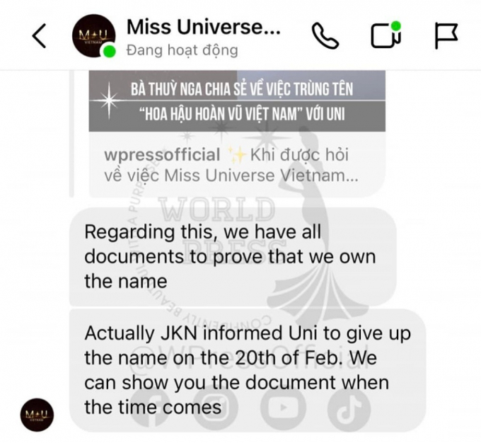 Đoạn tin nhắn của Miss Universe Vietnam trao đổi với chuyên trang sắc đẹp World Press.