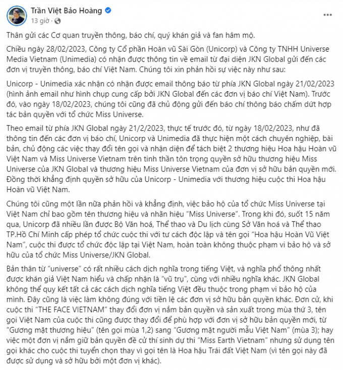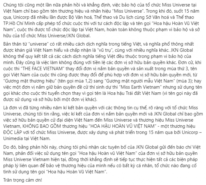 Đồng thời, đại diện của tổ chức Hoa hậu Hoàn vũ Việt Nam - CEO Bảo Hoàng cũng vừa gây chú ý với bài viết được đăng tải nhằm làm rõ sự việc trên. Theo đó, anh cho rằng: "Chúng tôi phủ nhận các tuyên bố của JKN Global gửi đến báo chí Việt Nam, phản đối việc sử dụng tên gọi Hoa hậu Hoàn vũ Việt Nam của đơn vị sở hữu bản quyền Miss Universe Vietnam hiện tại, đồng thời khẳng định sẽ tiếp tục thực hiện tất cả các biện pháp pháp lý liên quan để bảo vệ thương hiệu của mình nếu có bất kỳ cá nhân, tổ chức nào đang cố tình sử dụng tên gọi Hoa hậu Hoàn Vũ Việt Nam”.