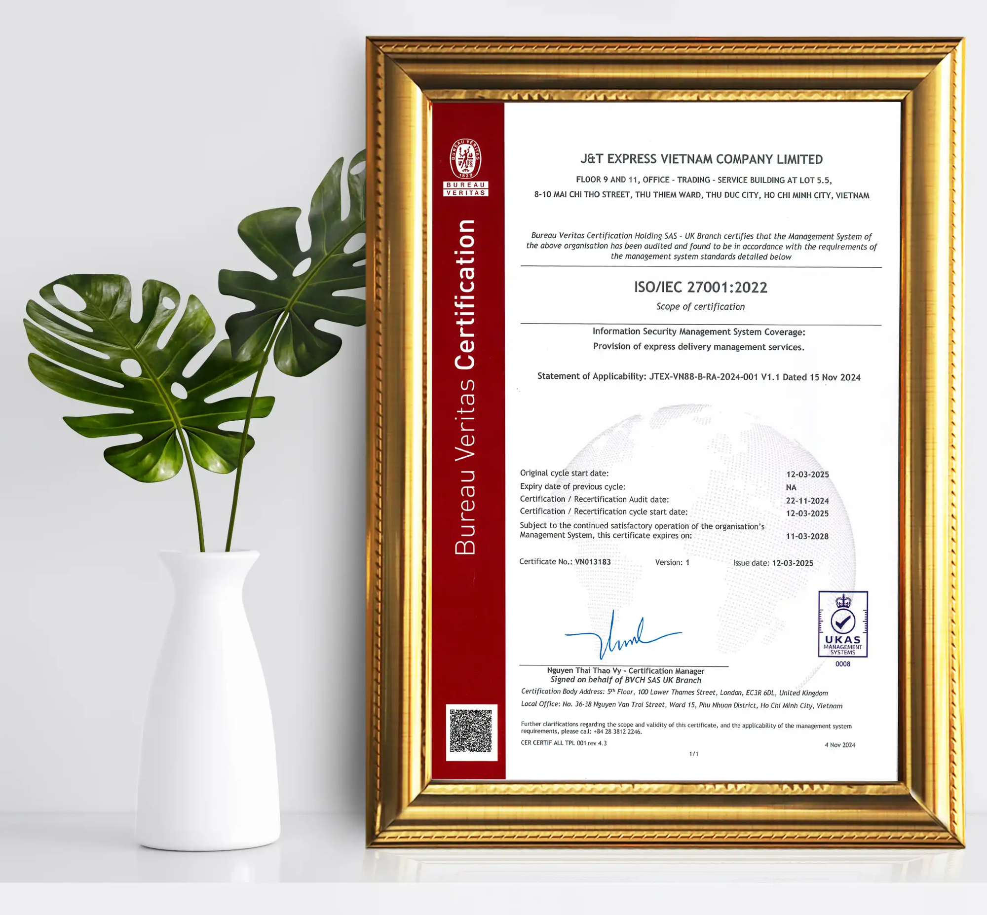 Năm 2025, J&T đã được cấp chứng nhận ISO/IEC 27001:2022 - tiêu chuẩn quốc tế về hệ thống quản lý an toàn thông tin. Đây được xem là lớp khiên vững chắc bảo vệ cho dữ liệu khách hàng, bảo đảm những giá trị quý giá nhất trong mỗi hành trình gửi – nhận.