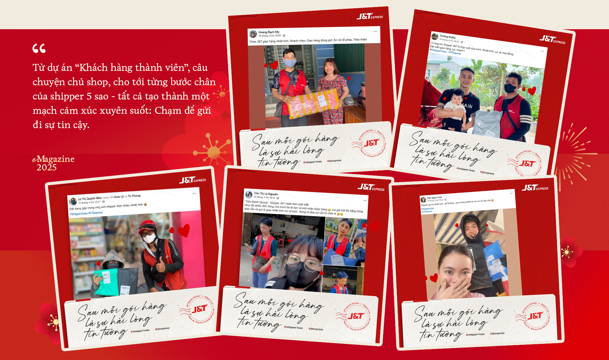 Từ dự án "Khách hàng thành viên", câu chuyện chủ shop, cho tới từng bước chân của shipper 5 sao - tất cả tạo thành một mạch cảm xúc xuyên suốt: Chạm để gửi đi sự tin cậy. Và chính tinh thần ấy đã khiến hình ảnh J&T trong mắt khách hàng không chỉ là một thương hiệu với màu đỏ đặc trưng. J&T trở thành biểu tượng của sự tin tưởng, của những kết nối được gìn giữ qua thời gian, của những câu chuyện nhỏ nhưng chạm được vào trái tim.