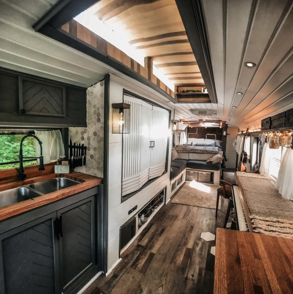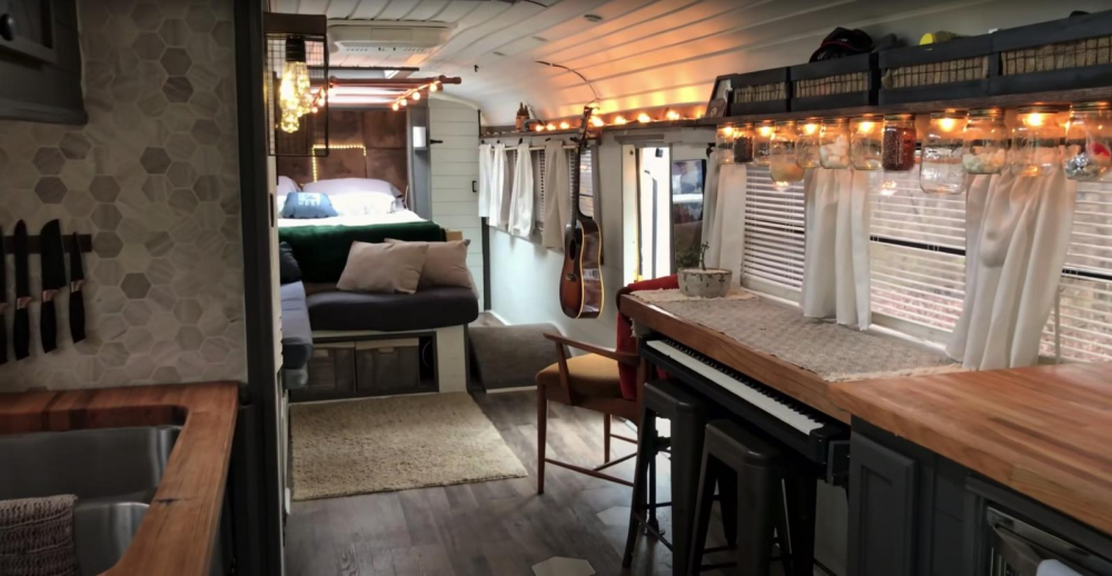 Ngôi nhà di động tí hon của anh ấy, được đặt tên là Roamer, mang lại một cảm giác rất nghệ thuật, một điều không thật bất ngờ vì Brackney cũng biết chơi guitar và piano. Trên thực tế, cây đàn guitar của anh ấy có một giá đỡ chuyên dụng bên trong xe buýt, và còn có chiếc bàn tích hợp bàn phím piano trượt ra. Chiếc xe buýt trường học được chuyển đổi thành motorhome này cũng mang đến cảm giác như một căn phòng ký túc xá đại học, với một giá sách được đặt bên cạnh chỗ ngồi của tài xế.