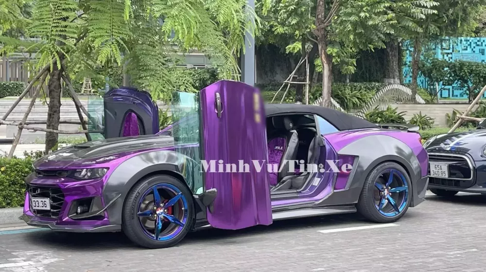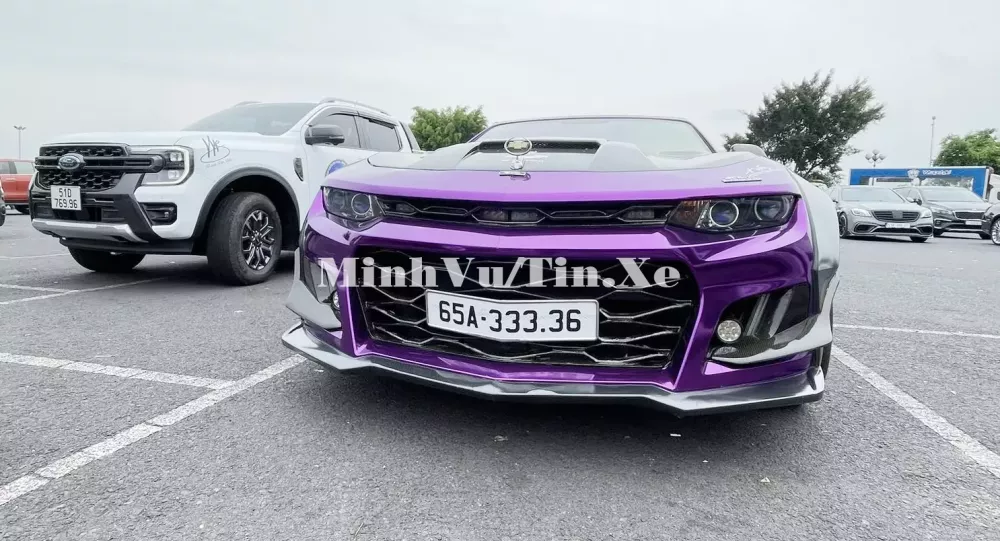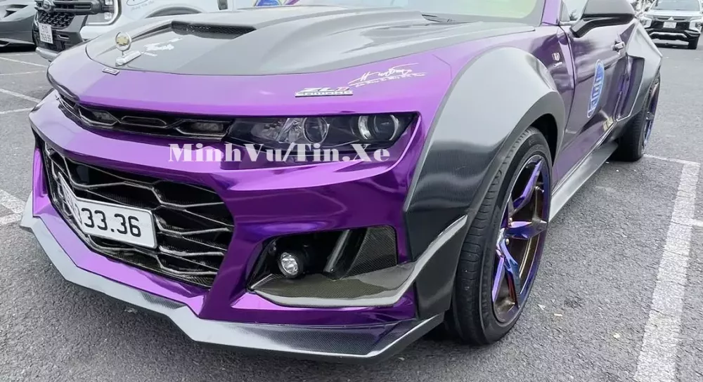 Ngoại thất của chiếc xe thể thao Chevrolet Camaro mui trần độ khủng của dân chơi Cần Thơ hiện có màu tím, tông màu yêu thích của chủ xe, điểm nhấn là nhiều chi tiết sơn đen, carbon.