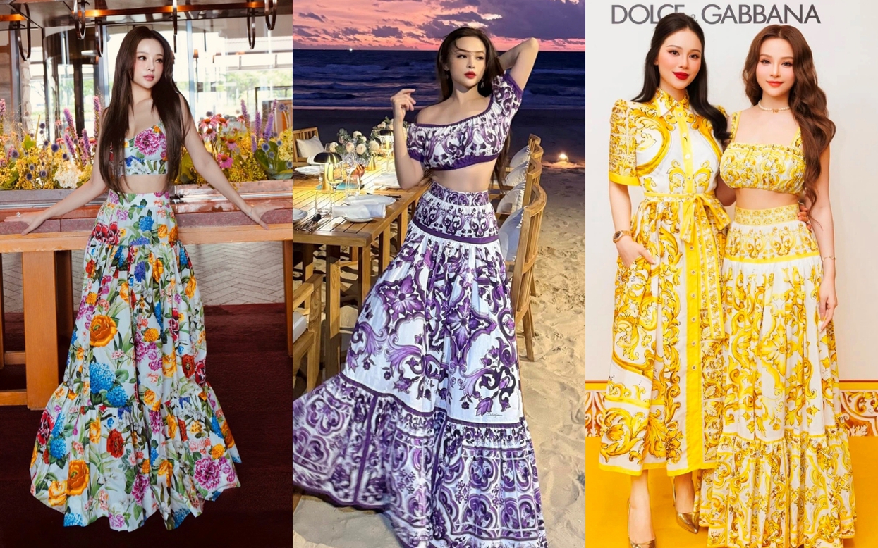 Đặc biệt, Huyền Baby không ngần ngại chi mạnh tay để sắm cả loạt set đồ gần giống nhau từ nhà mốt Dolce & Gabbana với giá khoảng 60 triệu đồng mỗi set. Từ sự kiện sang trọng đến những buổi dạo phố đời thường, cô đều biến tấu công thức crop top + chân váy dài để xuất hiện chỉn chu và thời thượng.