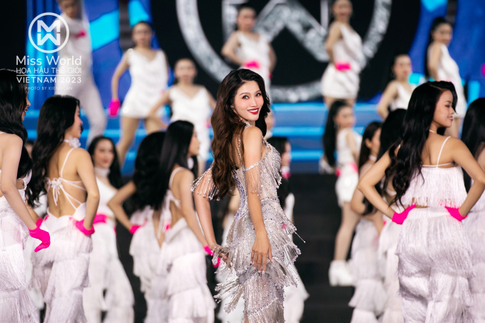 Trong phần mở màn, Quỳnh Châu diện chiếc váy được thiết kế với rất nhiều hạt kim sa lấp lánh, mái tóc lượn sóng bồng bềnh cùng môi son đỏ rực đã làm nổi bật nên gương mặt sắc sảo cùng nụ cười tỏa sáng thu hút mọi ánh nhìn. Nàng hậu nổi bần bật trong màn trình diễn cùng Top 59 thí sinh. Cô khẳng định phong thái của á hậu 1 Miss Grand Vietnam 2022 giữa dàn người đẹp Miss World Vietnam 2023 rạng rỡ, tỏa sáng trên sân khấu.