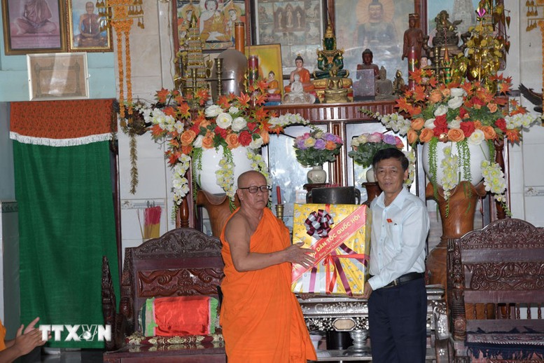 Chủ tịch Hội đồng Dân tộc của Quốc hội Lâm Văn Mẫn tặng quà cho Hòa thượng Hữu Hinh, Trụ trì chùa Ghositaram (xã Hưng Hội, tỉnh Cà Mau) - Ảnh: TTXVN