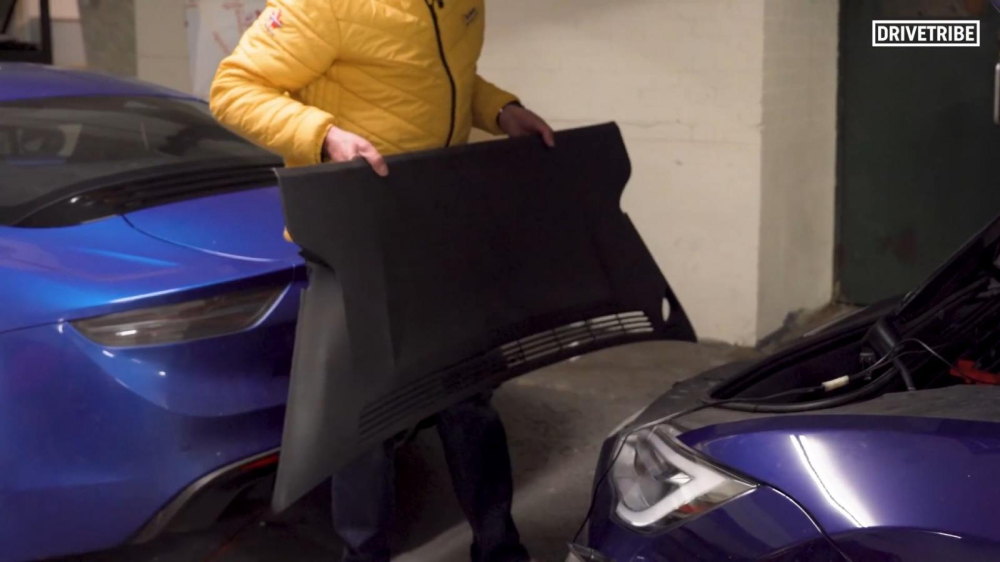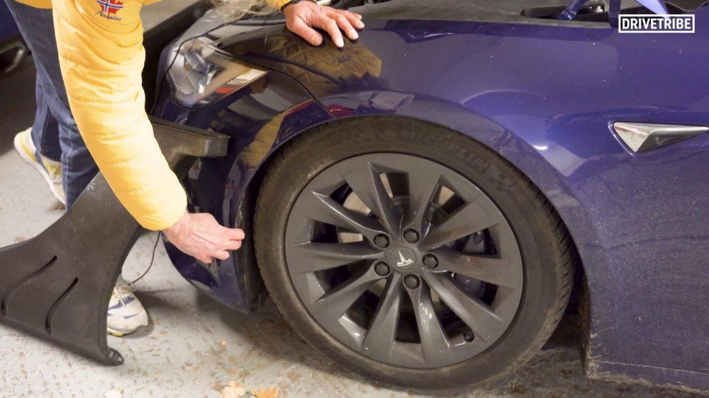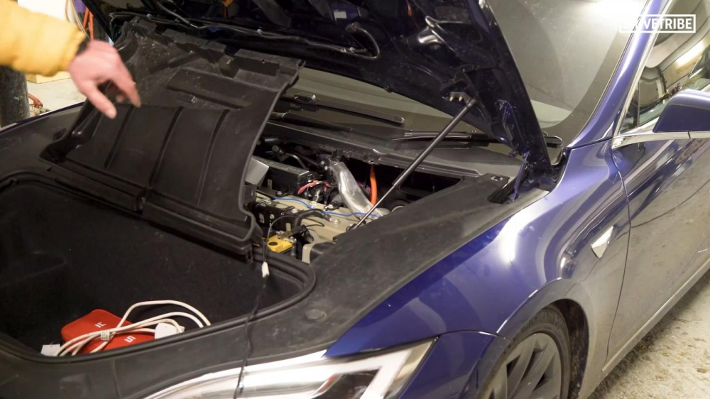 Ở bên dưới tấm ốp hai vòm bánh xe trước, Tesla có bố trí 2 lẫy khóa để người dùng có thể có thể mở nắp capô trong trường hợp hệ thống điện có vấn đề. Sau khi kéo 2 lẫy ở hai bên vòm bánh xe, James May cuối cùng đã mở được nắp capô, sau đó tiếp tục tháo thêm 3 tấm ốp nhựa để có thể đến được bộ ắc quy. "Chỉ để sạc ắc quy, các bạn phải tháo dỡ chiếc xe. Việc này mất khoảng 1 giờ đồng hồ. Thú thực là điều đó làm tôi bực mình." James chia sẻ.