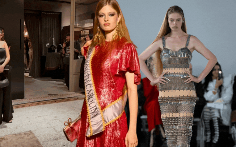 Màn chào sân của Vivian mở đầu tại show Alexis Bittar, nơi sàn diễn được dựng theo concept một cuộc thi Hoa hậu Mỹ giả tưởng. Trong bộ váy ánh kim đỏ rực đi cùng sash "South Carolina", cô hóa thân thành một thí sinh hoa hậu quyền lực và kiêu hãnh. Vivian để mái tóc dài duỗi thẳng, rẽ ngôi lệch đơn giản, vừa gợi nét nữ tính vừa toát lên sự lạnh lùng. Lớp trang điểm tập trung vào nền da bóng mượt, kết hợp điểm nhấn nhẹ ở môi và gò má, tạo tổng thể thanh thoát nhưng vẫn sắc sảo.
