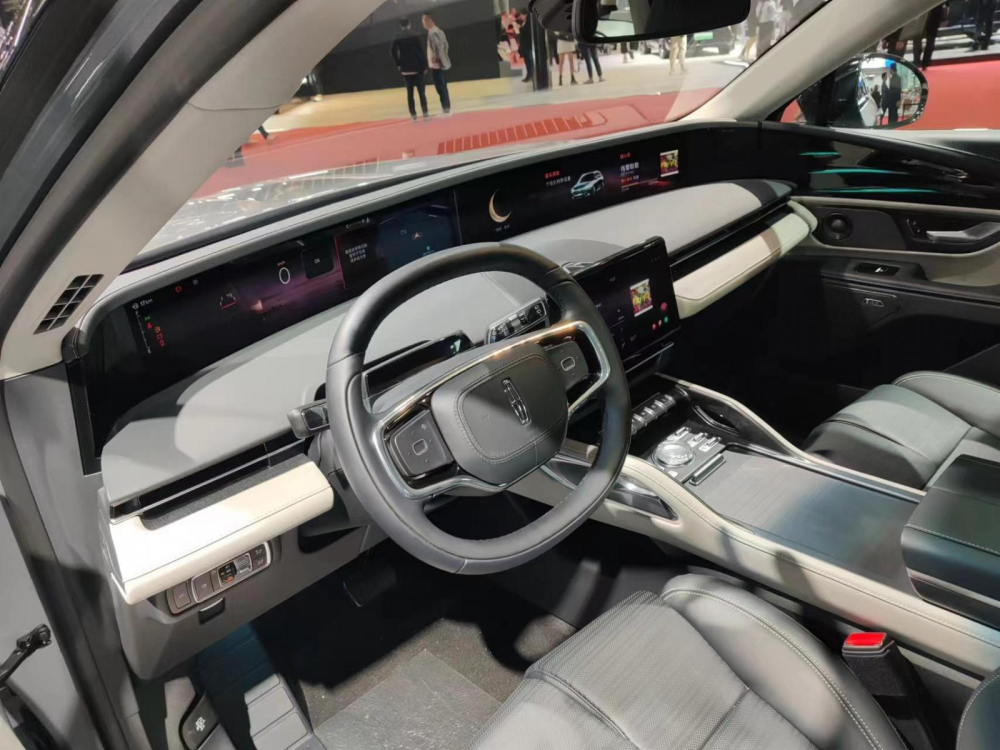 Về nội thất, có thể thấy khoảng cách giữa 2 màn hình vòm 23,6 inch và bảng điều khiển trung tâm là tương đối lớn, gây bất tiện cho bên ghế phụ khi trực tiếp chạm và điều khiển, nên chúng tôi suy đoán rằng màn hình trên phía đồng lái có thể không phải là màn hình giải trí mà là màn hình hiển thị các thông tin về xe.