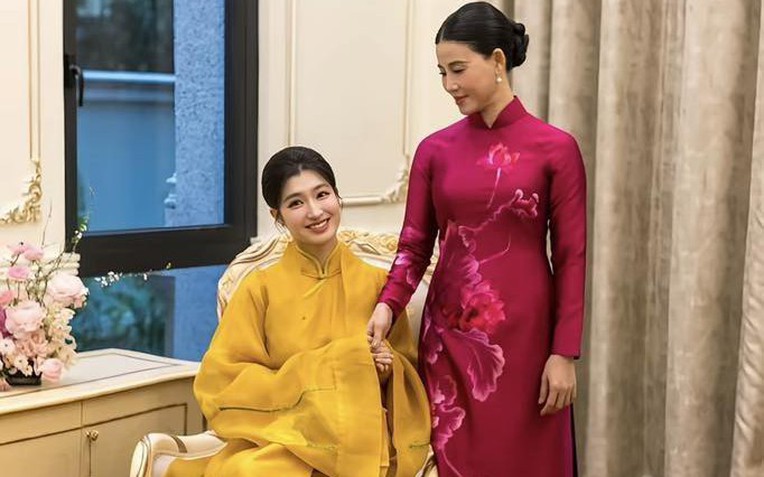 Trong ngày Phương Nhi tổ chức lễ hằng thuận và đón dâu, bà Đoàn Thị Nguyệt diện áo dài truyền thống màu hồng nhạt và hồng đậm với hoạ tiết hoa sen được may đo riêng. Khoảnh khắc mẹ Phương Nhi âu yếm nhìn cô con gái đang diện đồ cô dâu khiến nhiều người xúc động.