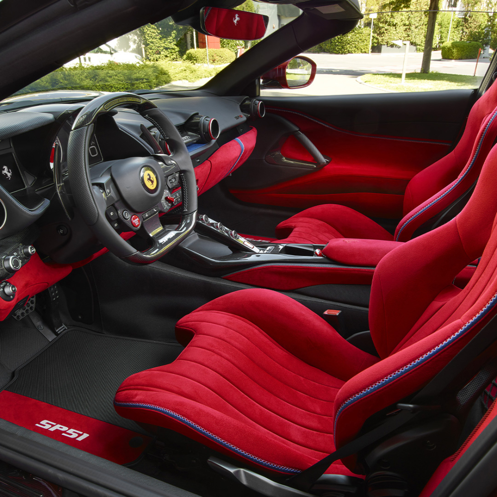 Tương tự phần ngoại thất, bên trong khoang lái của siêu xe độc bản Ferrari SP51 cũng sở hữu tông màu đỏ Rosso Passionale chủ đạo, kết hợp với các điểm nhấn màu xanh navy và trắng. Cách bài trí nội thất của SP51 tương tự nguyên mẫu 812 GTS nhưng yếu tố độc quyền là phần da nhuộm đỏ, logo SP51 trên bậc cửa hay giữa 2 ghế ngồi.