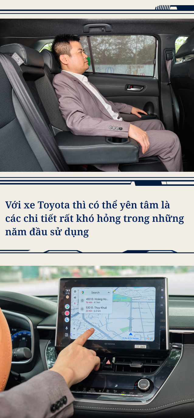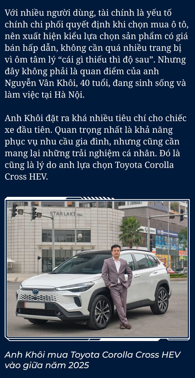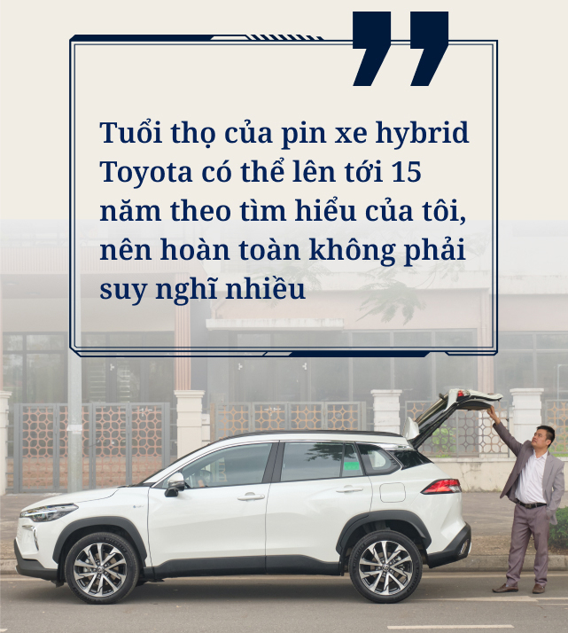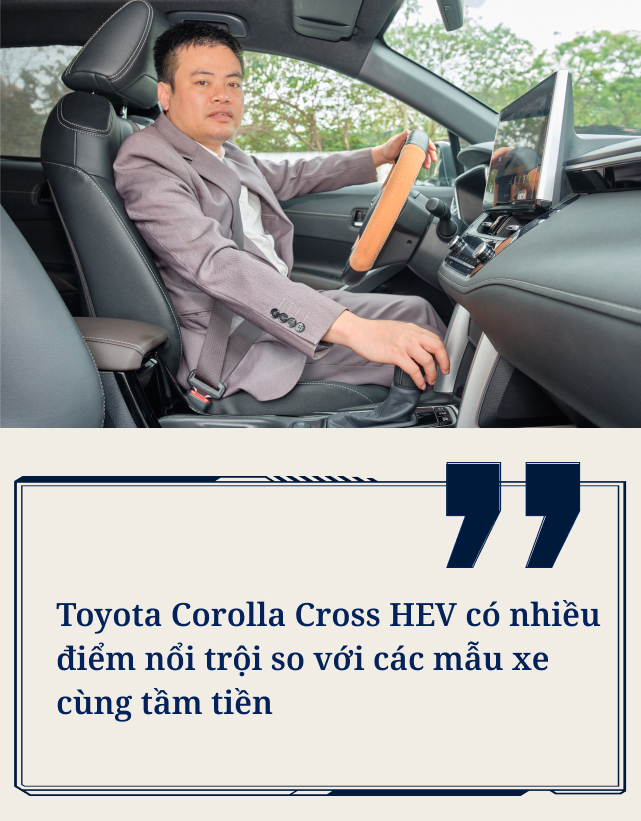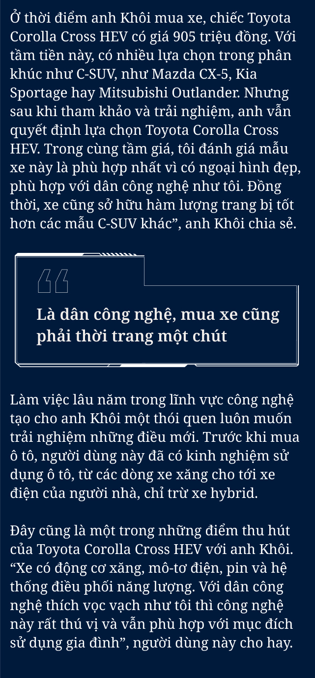 Theo anh Khôi, việc chấp nhận chi thêm tiền để mua bản hybrid của Toyota Corolla Cross cho phép anh “tận hưởng trang bị của bản full, đi sướng hơn, êm ái hơn nhờ sự hỗ trợ của mô-tơ điện”.