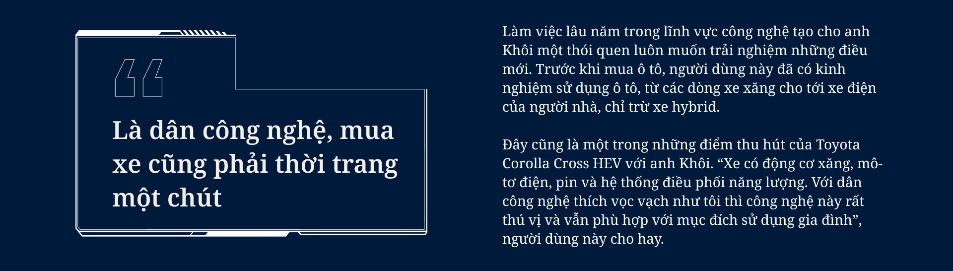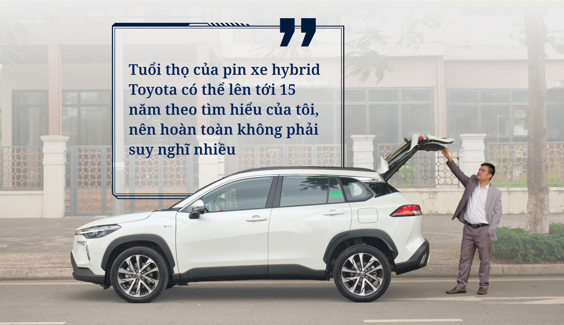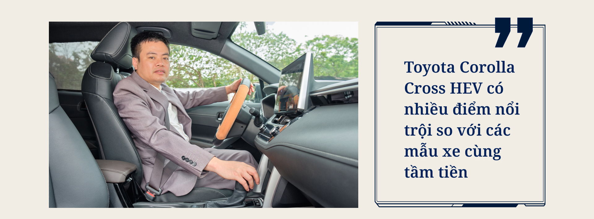 Theo anh Khôi, việc chấp nhận chi thêm tiền để mua bản hybrid của Toyota Corolla Cross cho phép anh “tận hưởng trang bị của bản full, đi sướng hơn, êm ái hơn nhờ sự hỗ trợ của mô-tơ điện”.