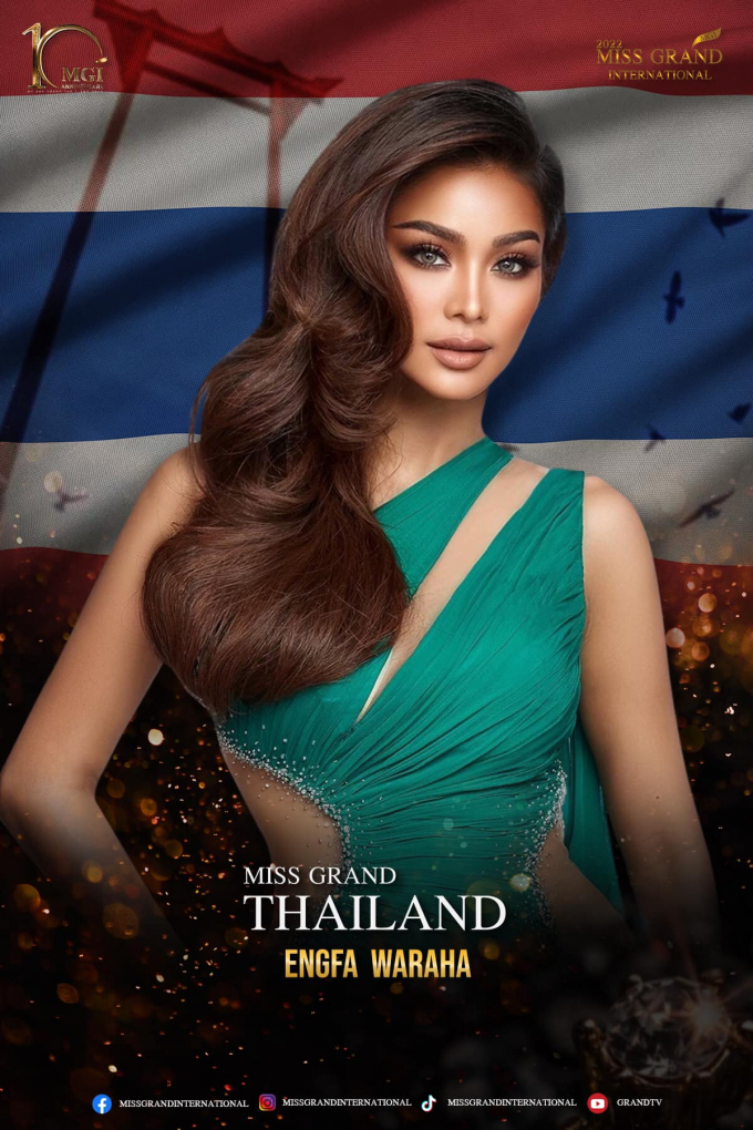 Engfa Waraha sinh năm 1995, đăng quang Miss Grand Thailand vào tháng 4/2022. Ngoài vương miện, Engfa Waraha còn đạt hai giải phụ Gương mặt ăn ảnh và Thí sinh có làn da đẹp. Trước khi trở thành hoa hậu, cô gái này đã là một nữ ca sĩ rất nổi tiếng ở xứ sở chùa Vàng. Engfa Waraha sở hữu trang Instagram với hơn 1,6 triệu người theo dõi và kênh TikTok 3,7 triệu người theo dõi.