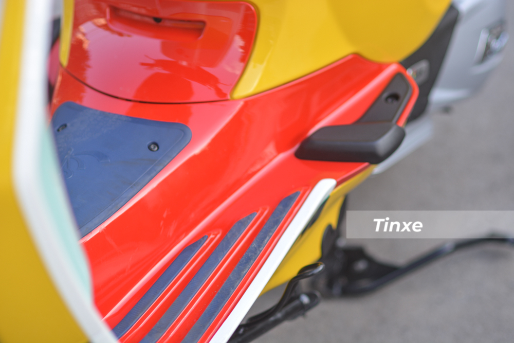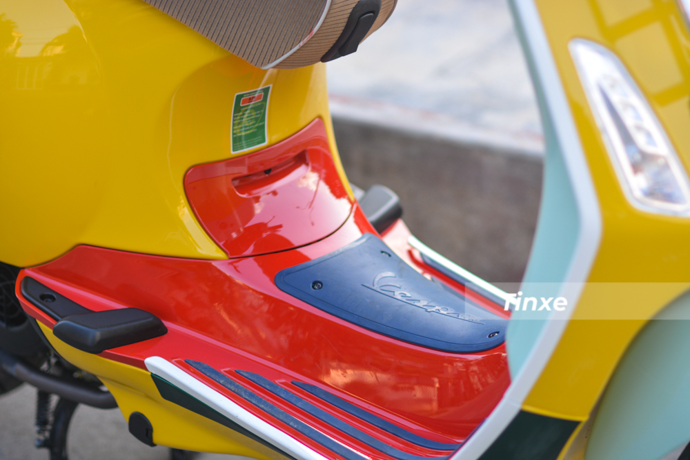 Mặt trong yếm xe của Vespa Primavera phiên bản Sean Wotherspoon được hoàn thành với màu xanh ngọc và vàng, điểm nhấn có thể kể đến như logo ABS màu đỏ và dòng chữ S125 hoàn thành màu đỏ và kim loại, nút mở yên màu đen...