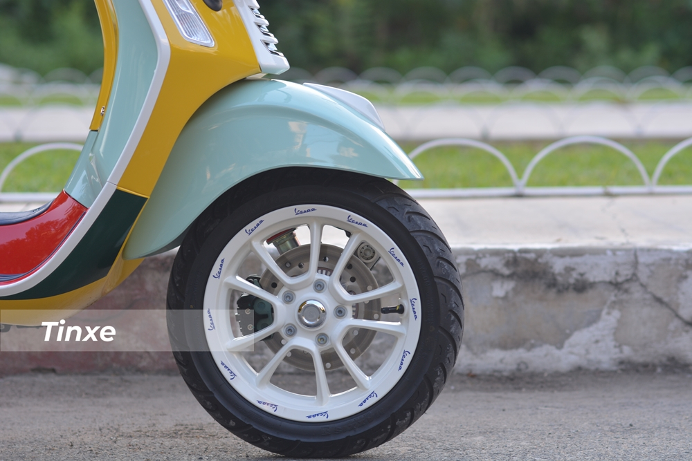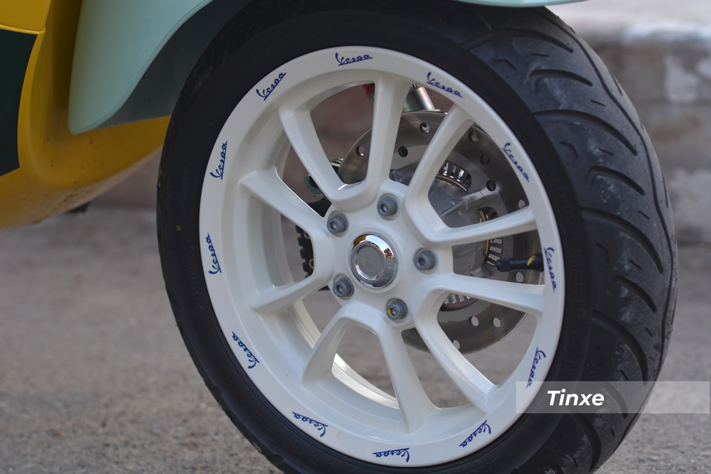 Điểm nhấn phối màu cuối cùng trên mẫu xe Vespa Primavera Sean Wotherspoon chỉ bán ra 50 xe tại thị trường Việt Nam chính là bộ mâm 5 chấu kép sơn tông màu trắng cùng đề-can Vespa màu xanh chạy dọc viền mâm.