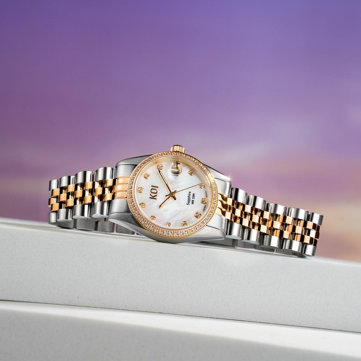 Sắc demi mạ vàng hồng (rose gold) công nghệ PVD tân tiến giúp KOI Watches ánh lên vẻ đẹp thanh lịch, nữ tính nhưng không phô trương. Sự "êm ru" ấy chính là lời cam kết về sự thấu hiểu khách hàng của KOI: Phụ nữ sinh ra là để được nâng niu!