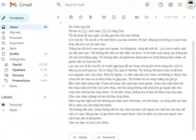 Bức tâm thư gửi qua mail cho Độ Mixi chia sẻ về câu chuyện fan nhí của chàng streamer không may qua đời vì bạo bệnh nhưng luôn nuôi ước mơ được gặp thần tượng trước khi rời khỏi trần giang.