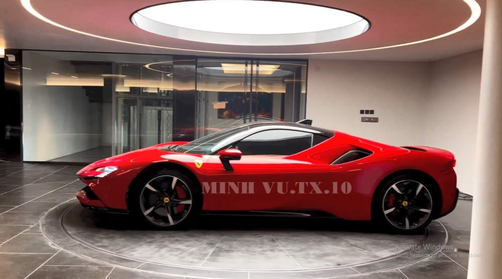 Trên trần là hệ thống đèn chiếu sáng giúp chiếc xe Ferrari SF90 Stradale đỗ phía dưới luôn long lanh khi chụp ảnh, ngoài ra, một hệ thống bàn xoay giúp việc đưa chiếc siêu xe hybrid ra vào garage xe rất dễ dàng, phải nói rằng, chồng cũ của nữ ca sĩ Lệ Quyên không chơi thì thôi, đã chơi là phải hàng chất lượng.