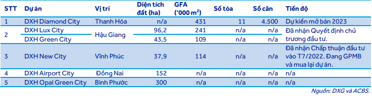 Theo ACBS, các dự án Opal Cityview và DXH Parkview tại Bình Dương sẽ được dời từ quý 3/2022 sang sang 2023 do những khó khăn trên thị trường bất động sản, cụ thể là thắt chặt tín dụng đối với cả chủ đầu tư và người mua nhà ảnh hưởng đến kế hoạch mở rộng quỹ đất, hoạt động bán hàng, thời gian triển khai và bàn giao dự án.
