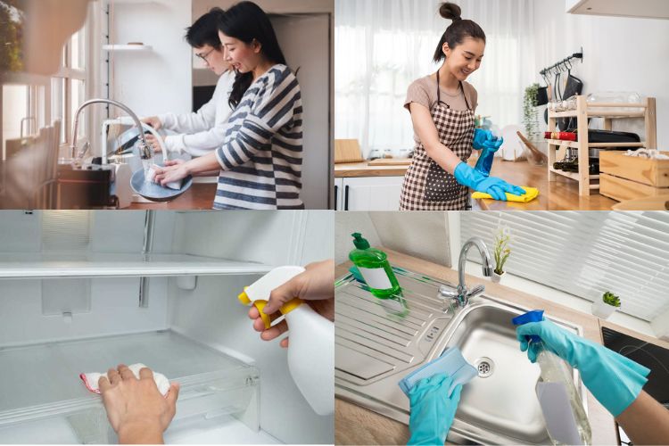 - Phòng bếp: Gian bếp tượng trưng cho tài lộc và hạnh phúc gia đình. Dọn dẹp tủ lạnh, loại bỏ thực phẩm quá hạn, sắp xếp lại ngăn kệ gọn gàng. Đừng quên làm sạch bếp gas, lò vi sóng và khu vực rửa chén.